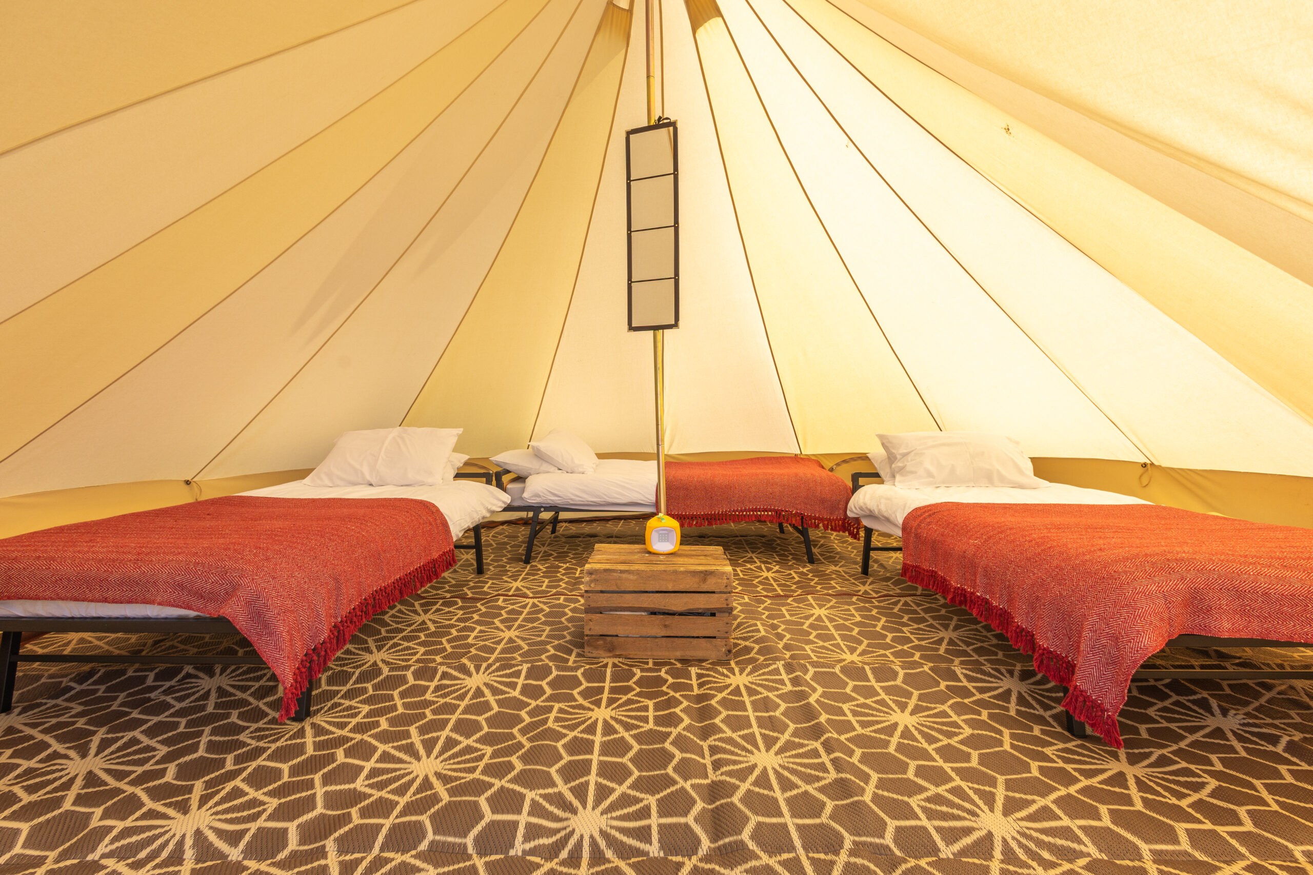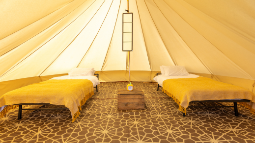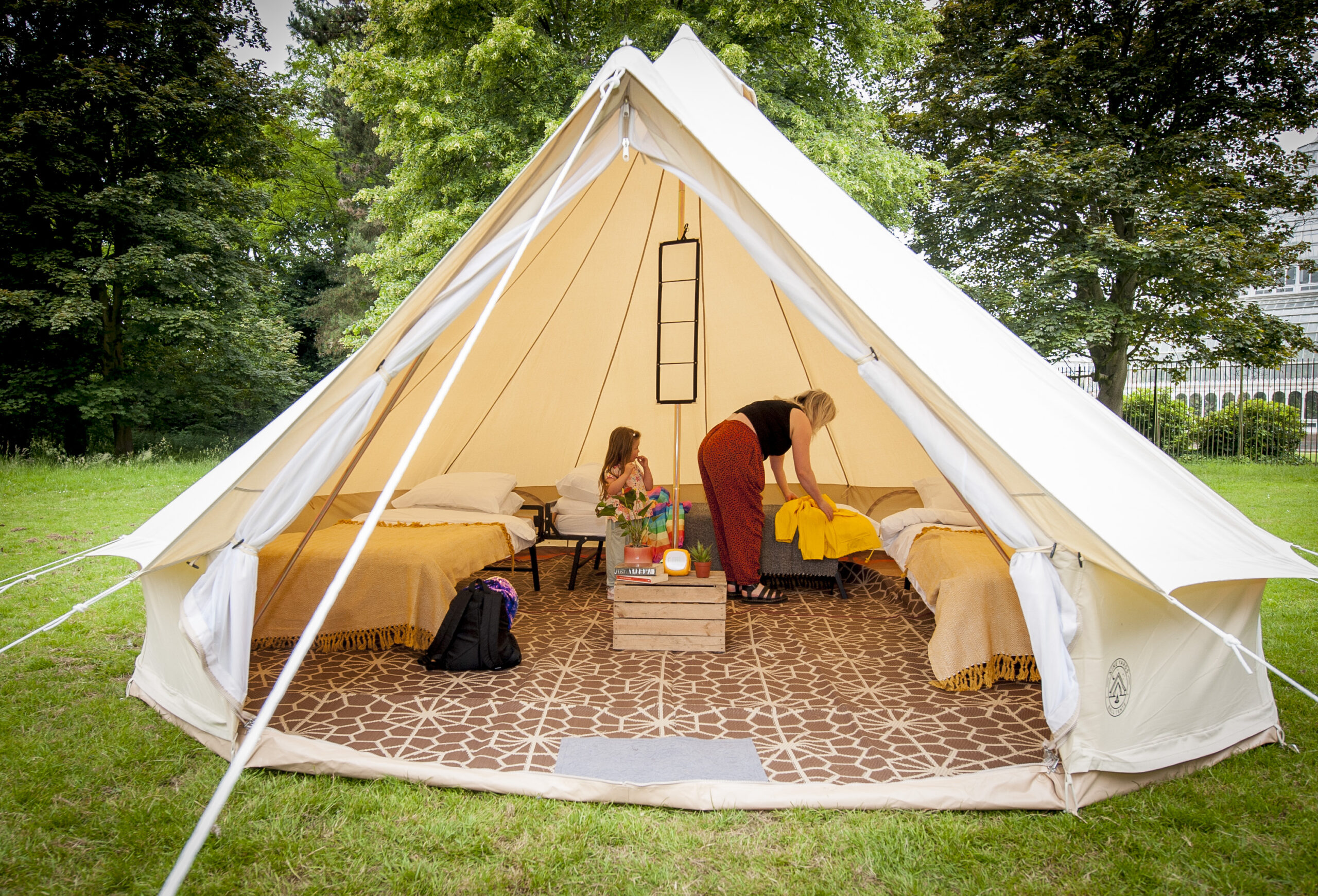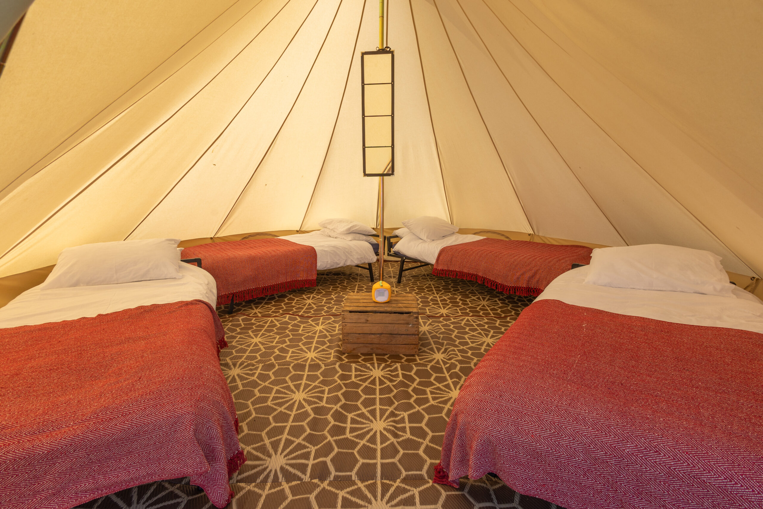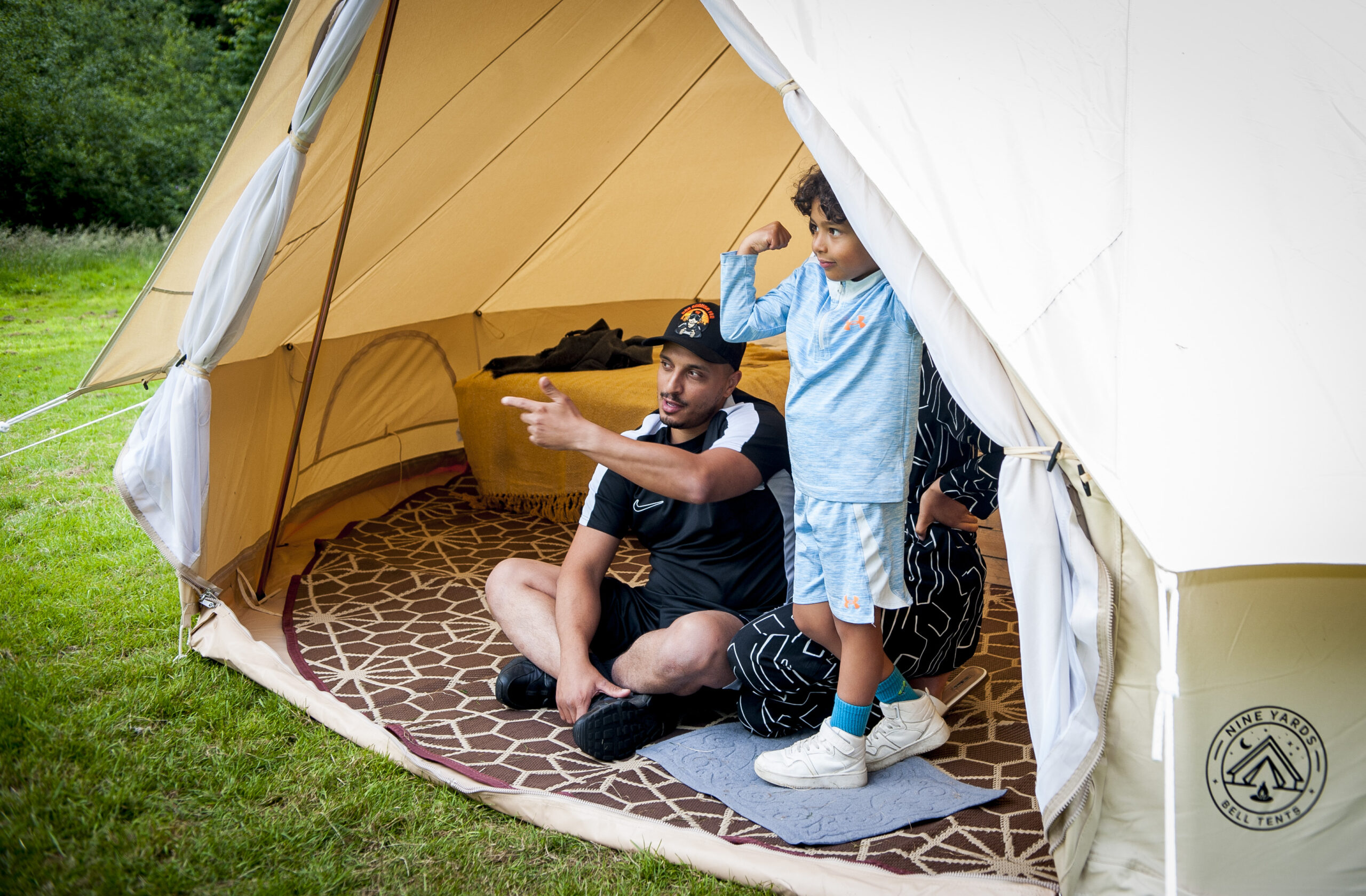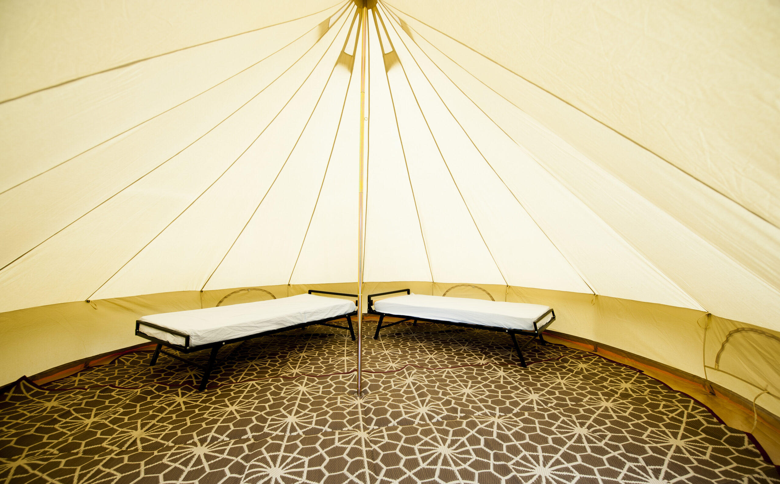 All Nine Yards Bell Tents are 5m diameter, 3m tall, with floor space of almost 20sqm. They’re made from 320gsm cotton canvas with a custom, extra large 2m entrance with fly sheets on the front door and windows too.