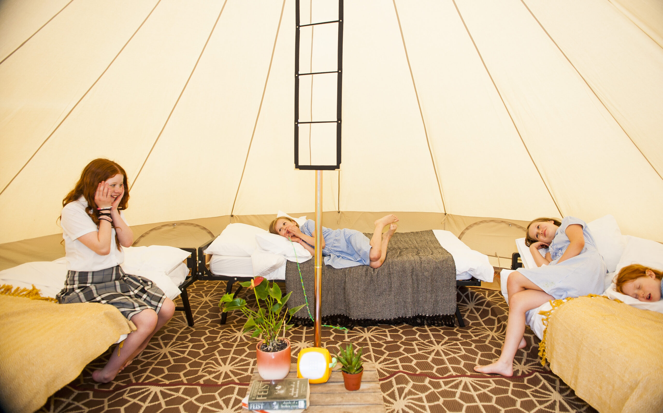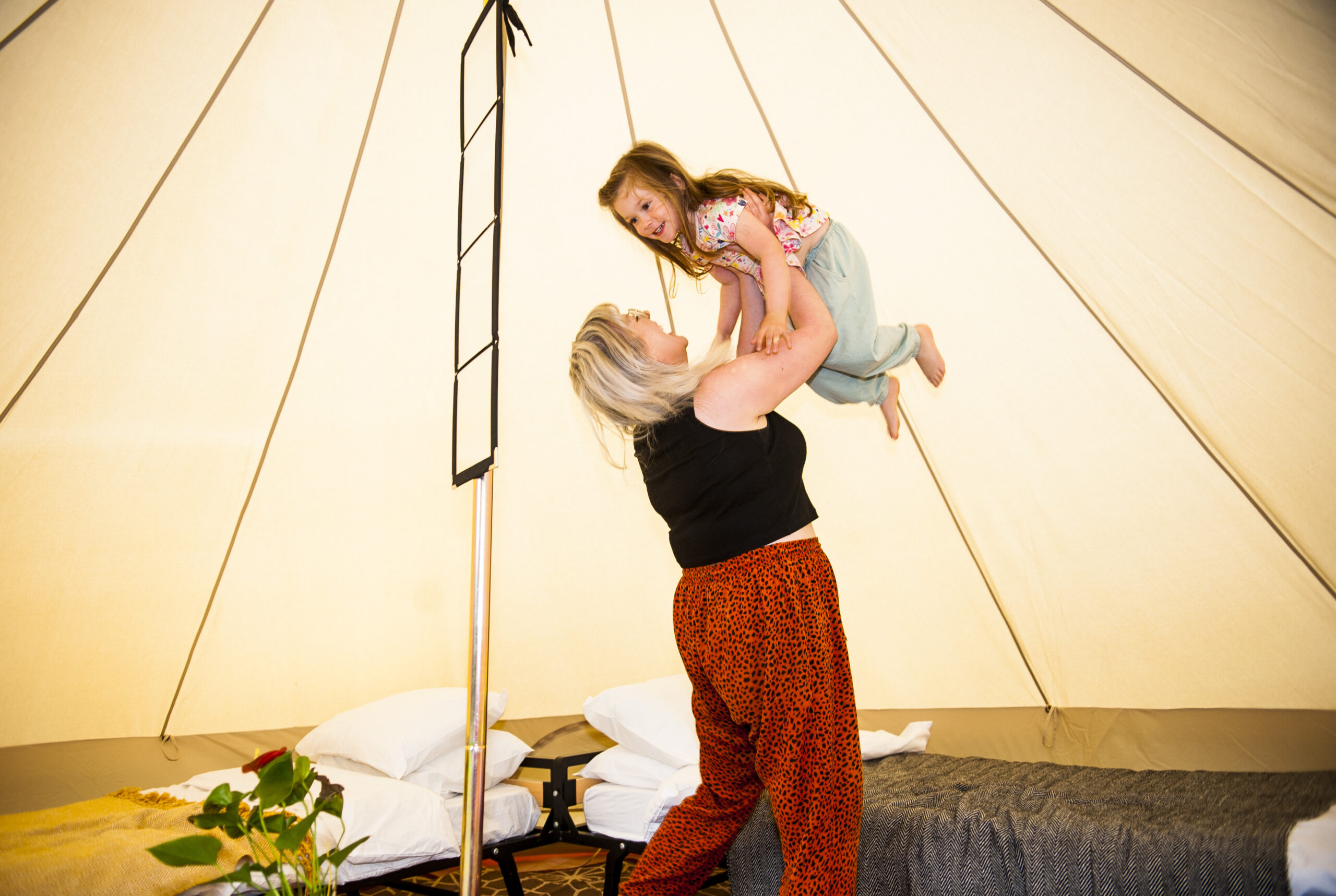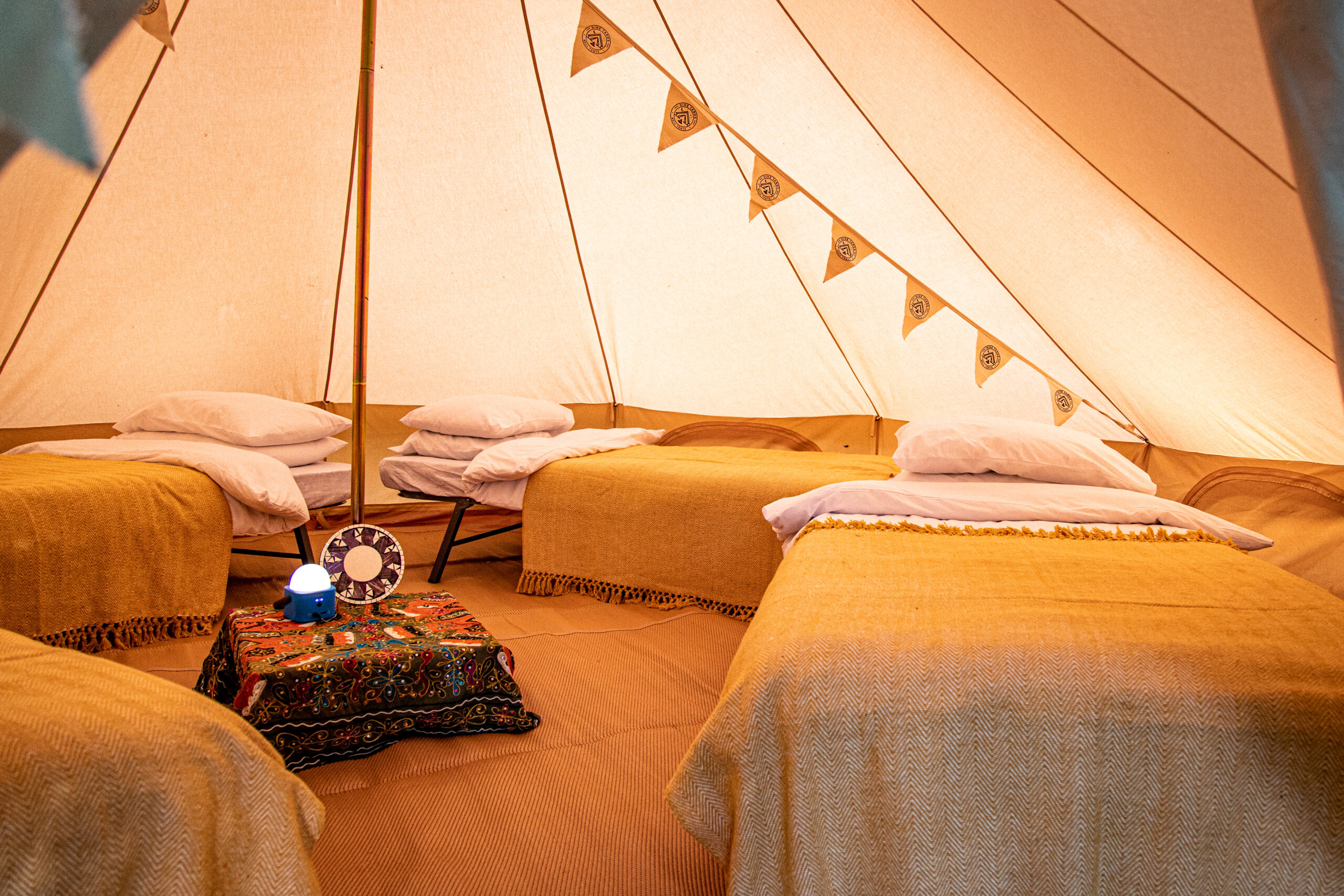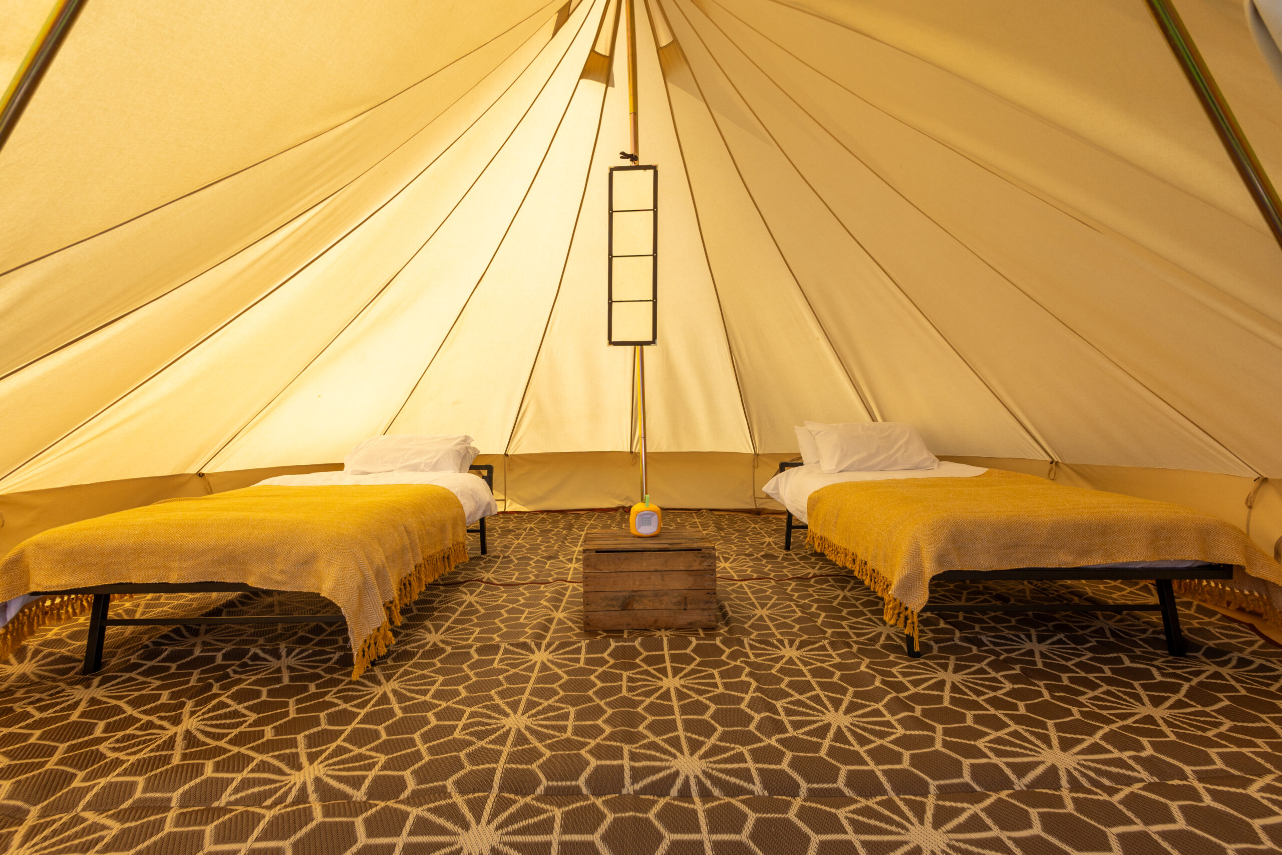 All Nine Yards Bell Tents are 5m diameter, 3m tall, with floor space of almost 20sqm. They’re made from 320gsm cotton canvas with a custom, extra large 2m entrance with fly sheets on the front door and windows too.