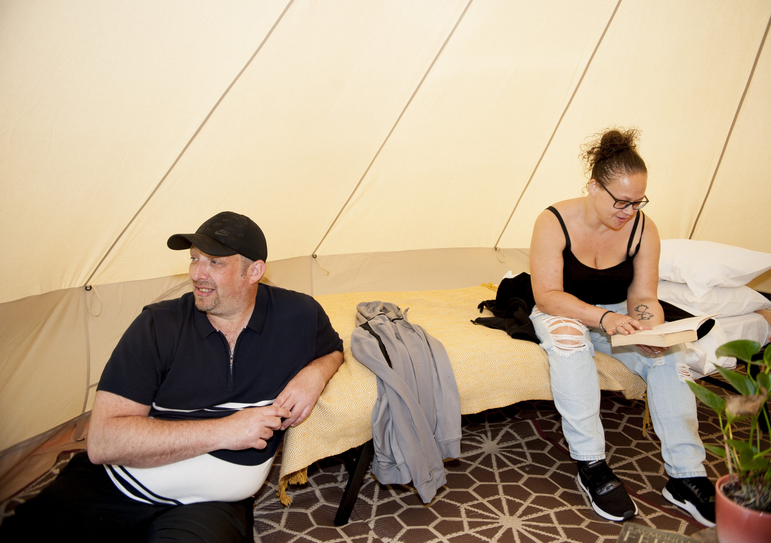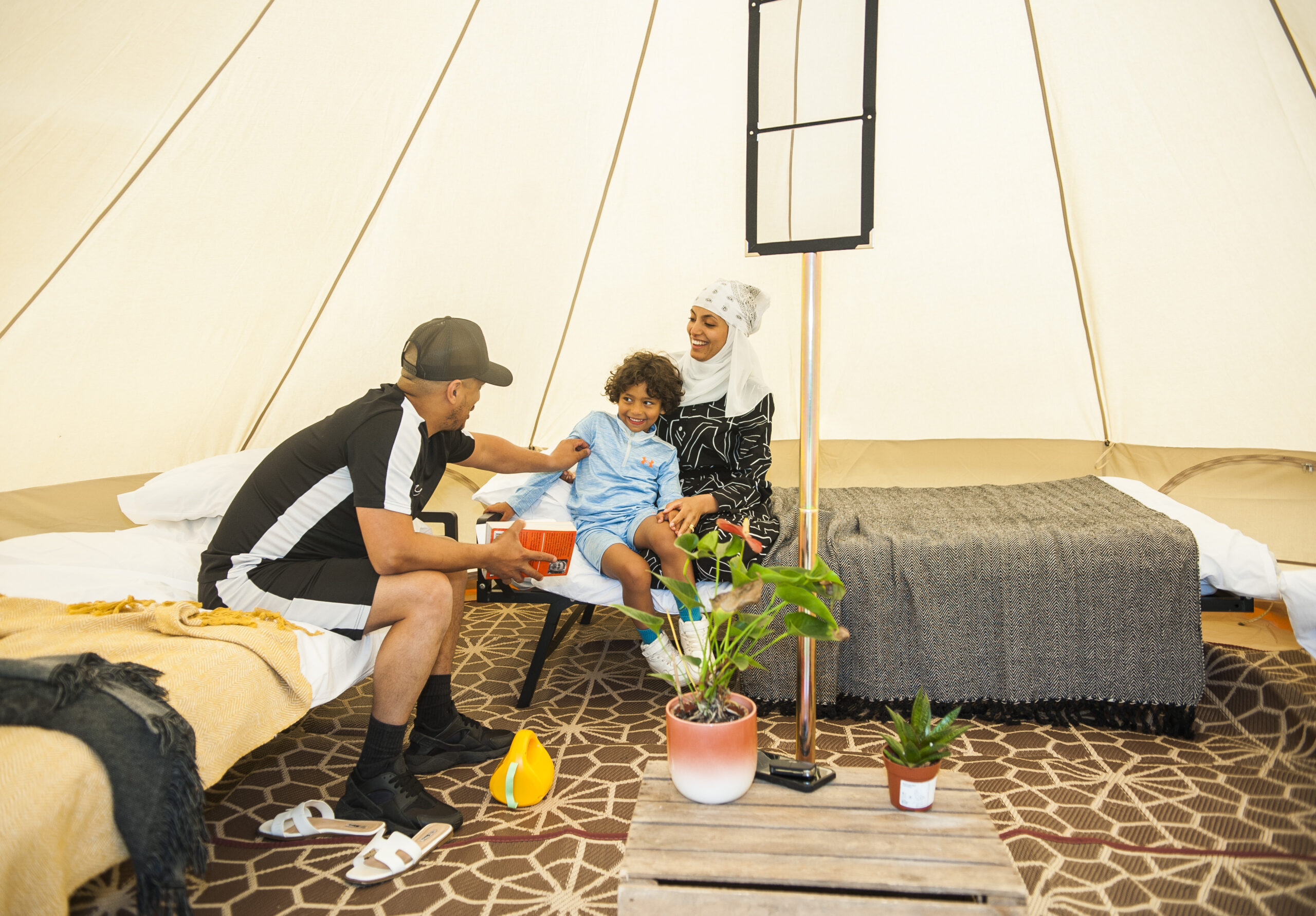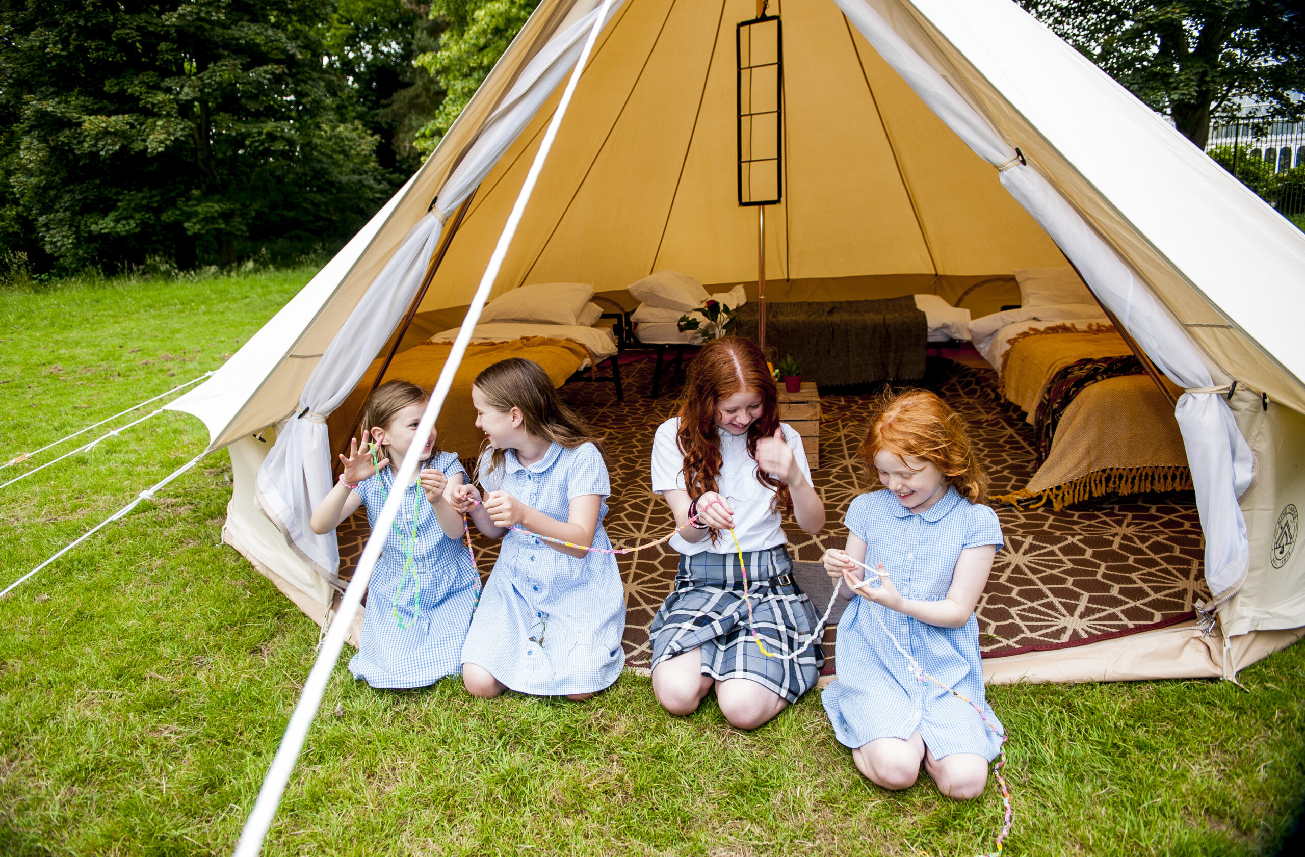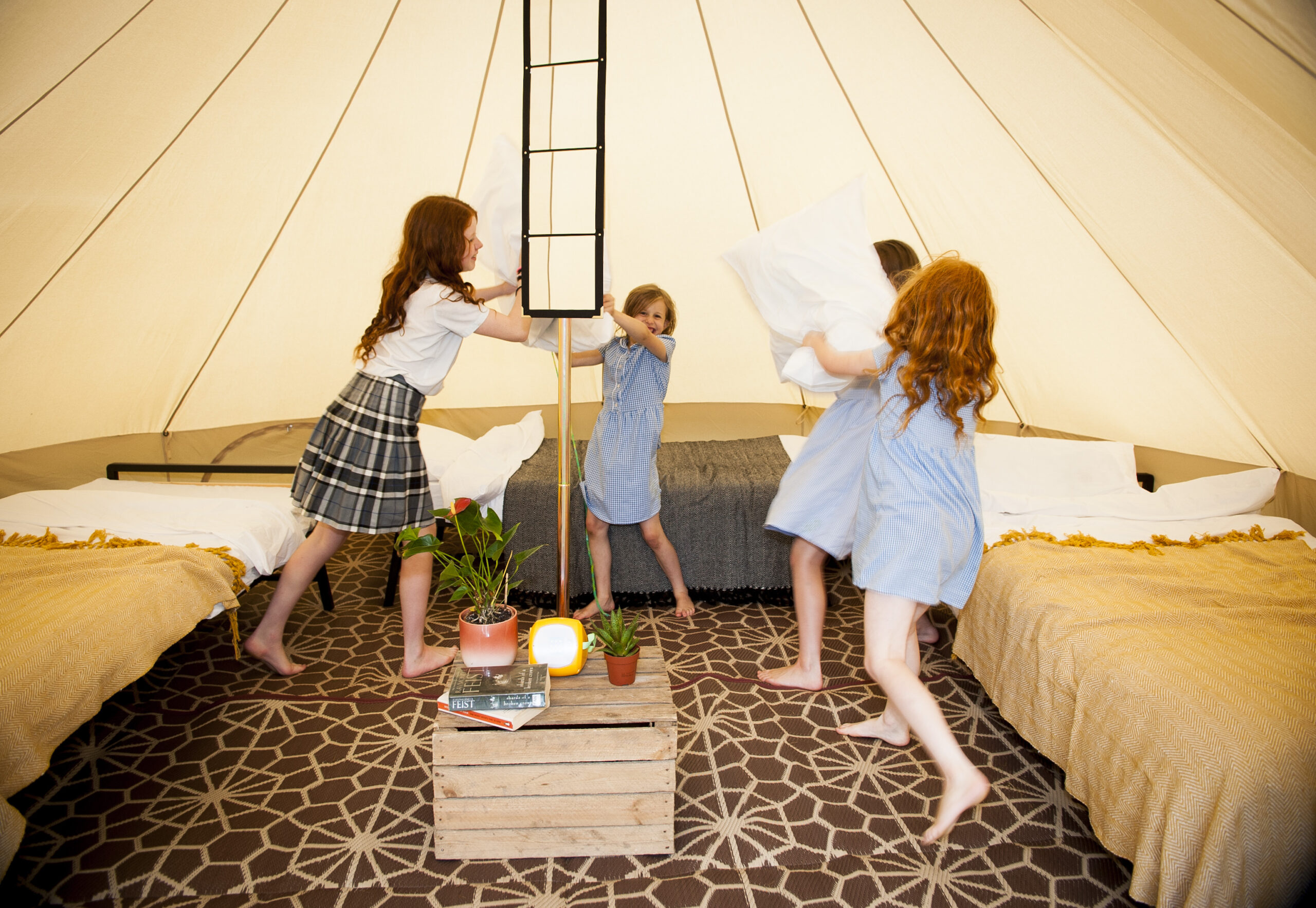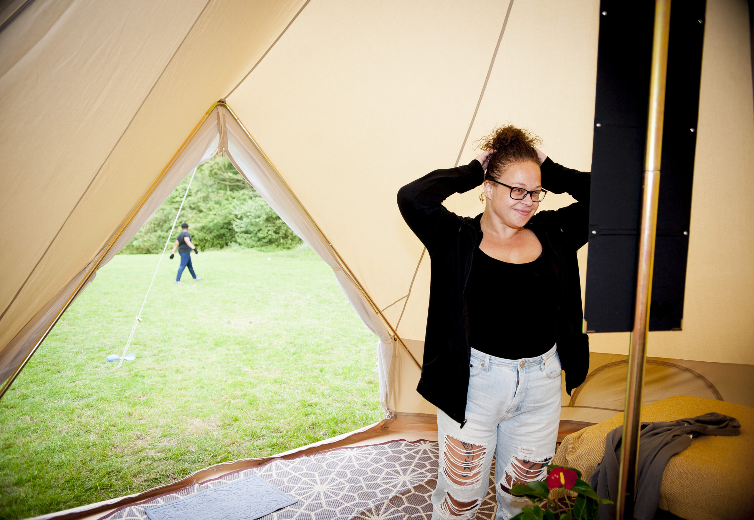All Nine Yards Bell Tents are 5m diameter, 3m tall, with floor space of almost 20sqm. They’re made from 320gsm cotton canvas with a custom, extra large 2m entrance with fly sheets on the front door and windows too.