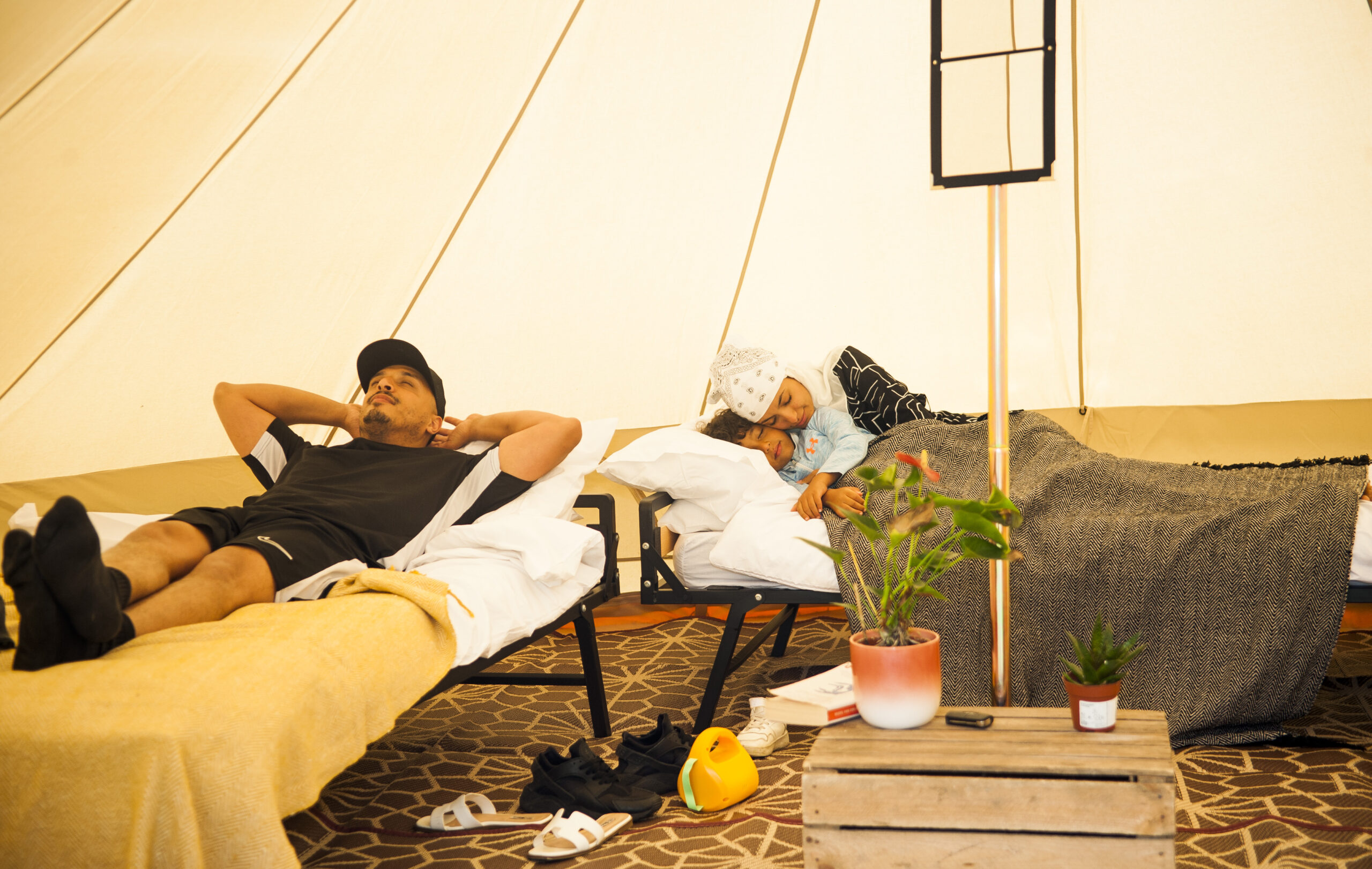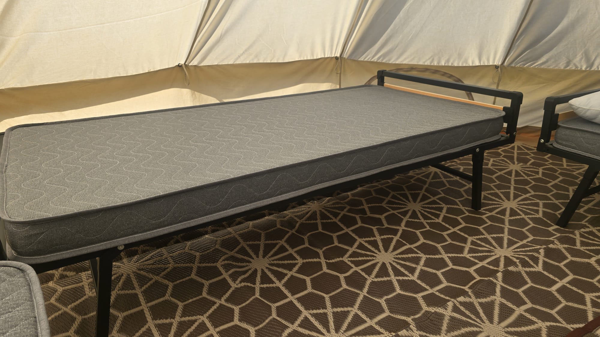 We only use real, full size (90x190cm) beds in our tents. They have metal frames with a header and footer plus a super comfortable foam mattress on top.
